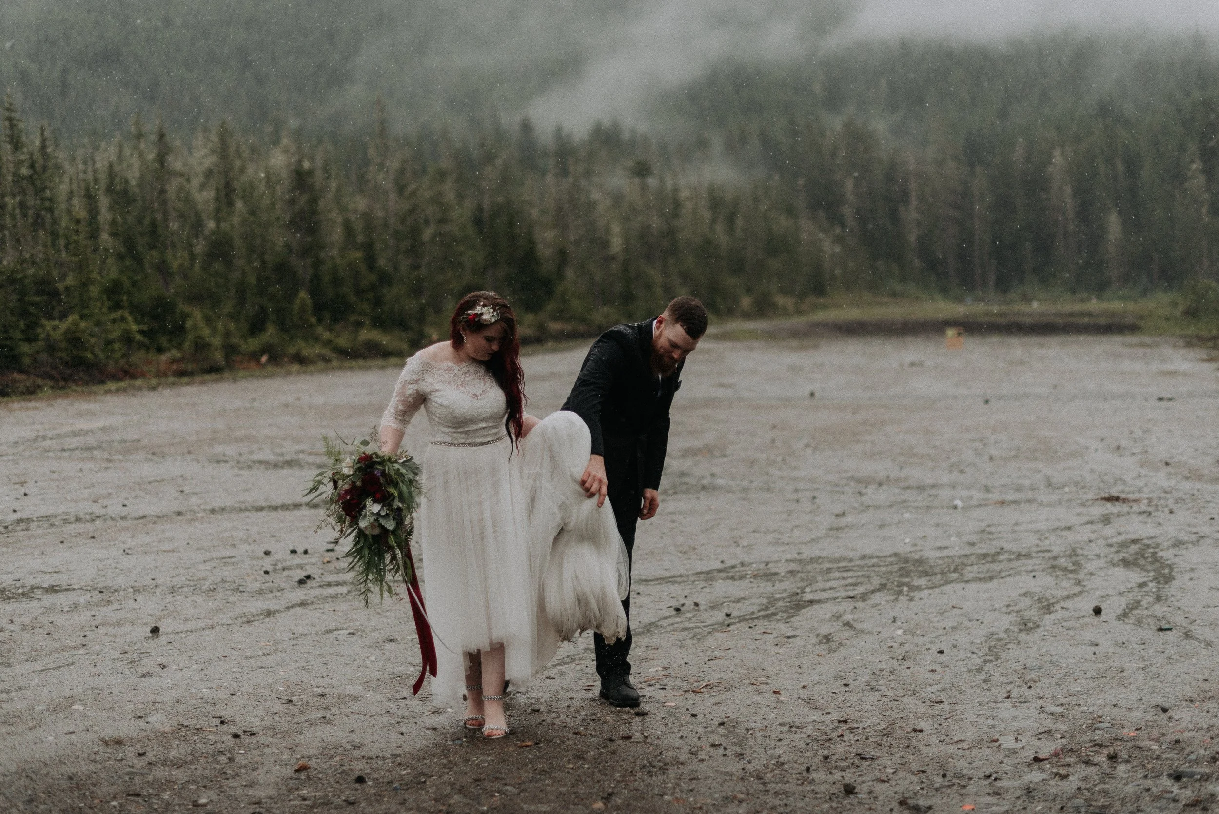 If you decide to have a train, that baby is getting dirty. We live in the nations largest rainforest and she is wet. Trains are beautiful and can contribute to a stunning and dramatic photographic result but they can hinder your movements. A train will require you to hold it with one hand, and you will likely have your flowers in the other hand. Unless you have a third hand or a tail (which I’ve always thought would be really handy), this doesn’t leave you a limb to cling onto your loved one. It can also make it difficult to move around. Think about your ceremony site, where we will be shooting and how you want that to feel. Stepping in and out of a helicopter, trekking across an ice field, walking across a soggy grass field, etc.